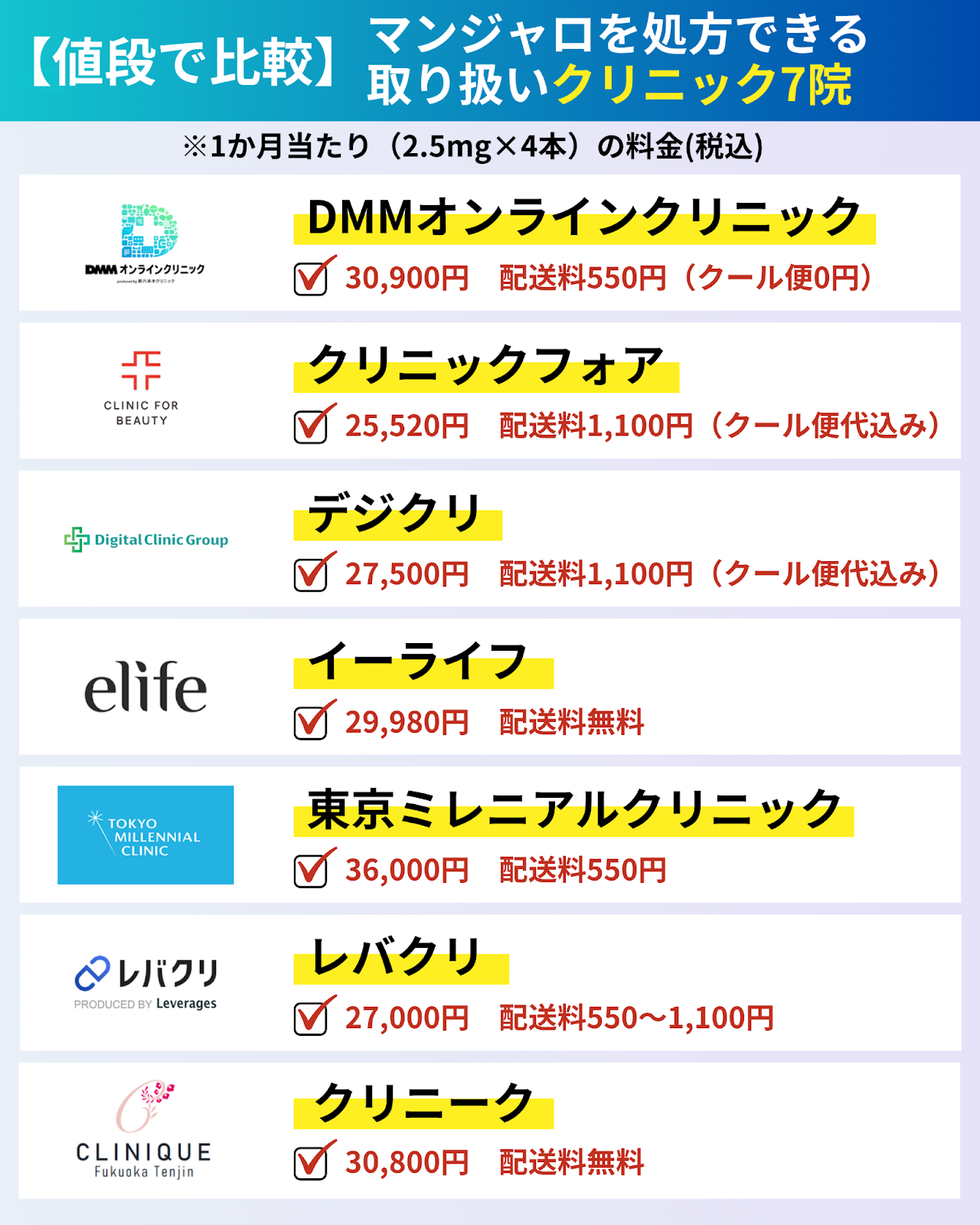 【値段で比較】マンジャロを処方できる取り扱いクリニック7院