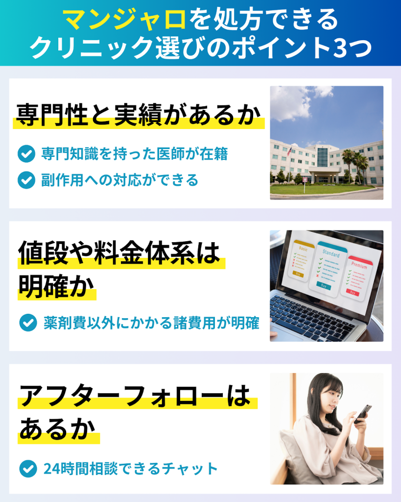 マンジャロを処方できるクリニック選びのポイントとして、以下の3つを解説する。